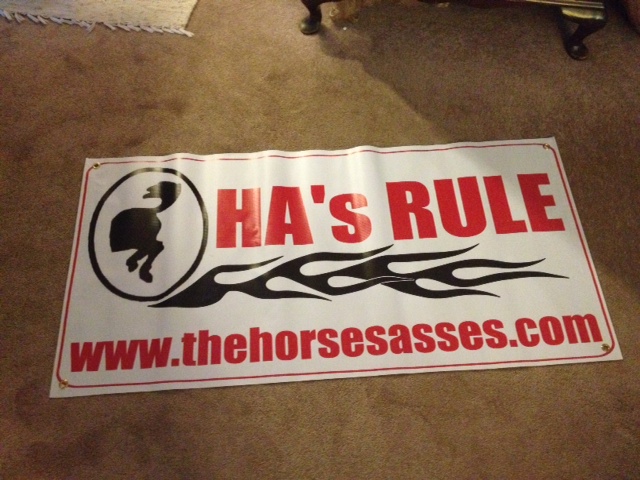 Many of you will remember seeing this banner in front of a bunch of HORSES ASSES' cars. Not on the TV, it is hanging from the ceiling!!!